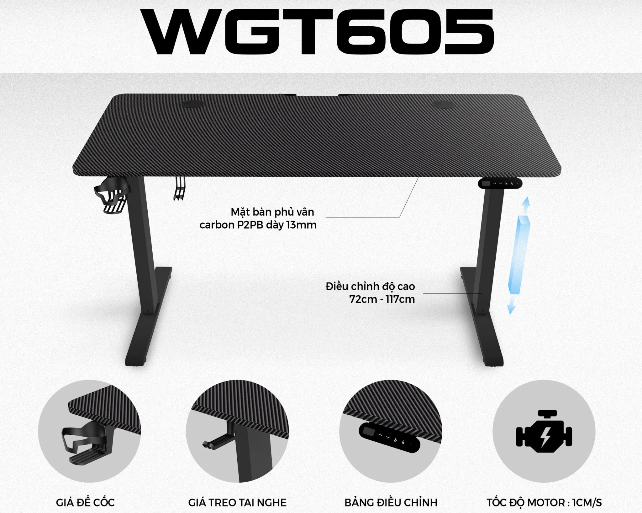 Bàn Nâng Hạ Điện WARRIOR WGT605 Black (Tải 80kg/ Mặt bàn 140 cm/ Cao 72-117cm)