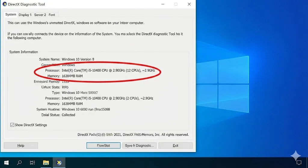 dxdiagvà nhấn Enter.Tại thẻ System: Xem thông tin Processor (CPU) và Memory (RAM).