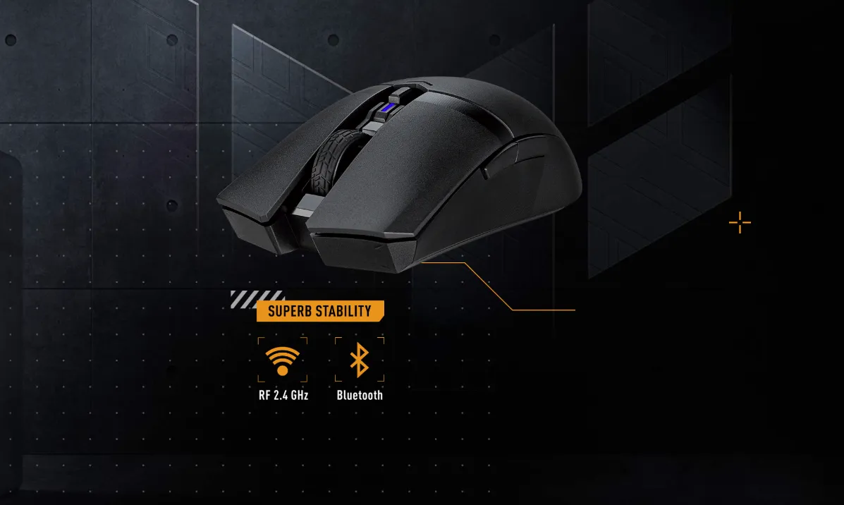 Chuột TUF Gaming M4 Wireless hỗ trợ hai chế độ kết nối linh hoạt, gồm 2.4 GHz và Bluetooth, mang đến khả năng truyền tín hiệu ổn định và mượt mà trong mọi tình huống sử dụng.