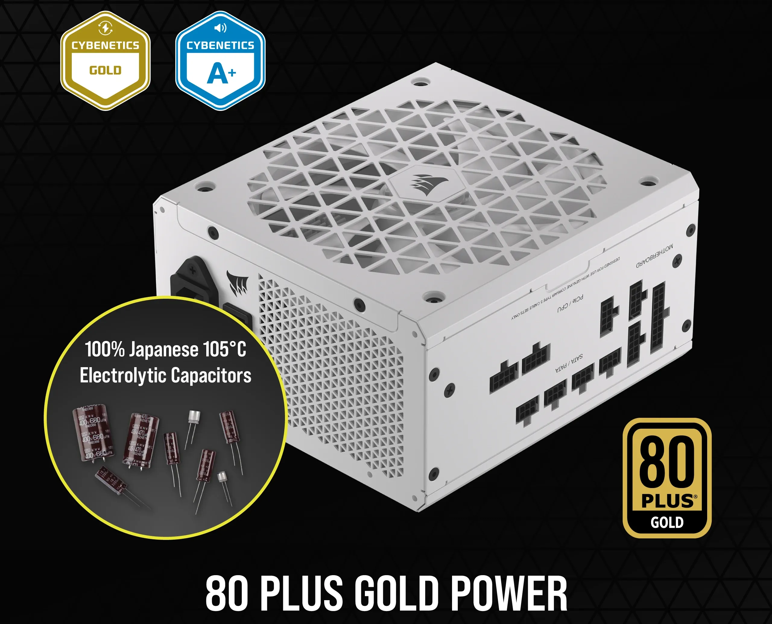 - RM1200x Shift White sử dụng tụ điện Nhật Bản chất lượng cao 105°C, đảm bảo hoạt động ổn định lâu dài. Quạt 140mm với chế độ Zero RPM giúp vận hành cực êm, gần như không tiếng ồn khi tải thấp. Bộ nguồn này cũng tương thích chuẩn ATX 3.0 và PCIe 5.0, sẵn sàng cho các GPU đời mới với đầu cấp 12VHPWR 600W.