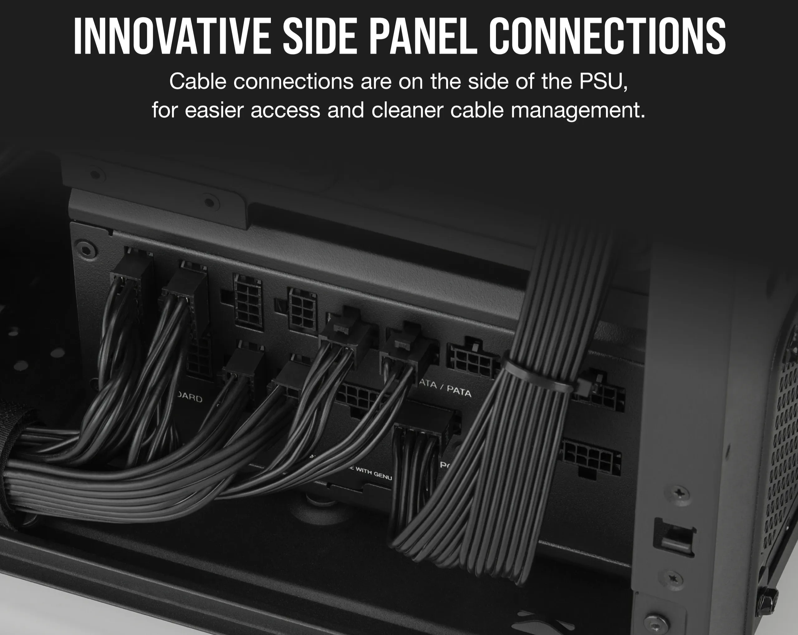 Điểm nổi bật nhất của RM750x Shift chính là thiết kế SHIFT độc quyền: toàn bộ cổng cắm dây được đặt bên hông thay vì phía sau. Thiết kế này giúp bạn dễ dàng kết nối dây, quản lý gọn gàng, đặc biệt phù hợp với các thùng máy có tấm che PSU hoặc không gian hạn chế.