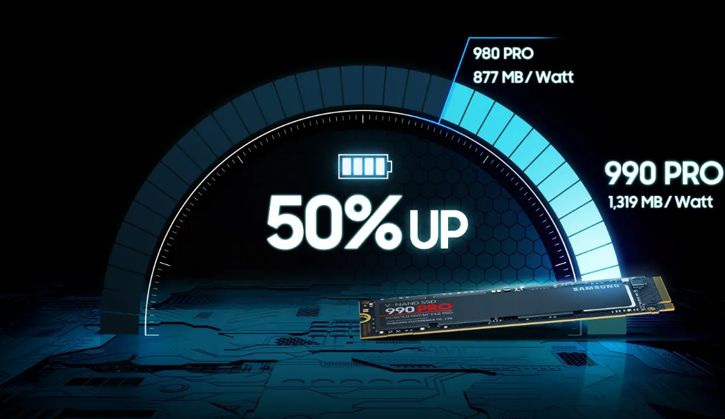 Vận hành tiết kiệm năng lượng hơn bao giờ hết. Thông thường, hiệu suất cao sẽ tiêu thụ nhiều điện năng, nhưng 990 PRO lại tiết kiệm năng lượng hơn với hiệu suất trên mỗi Watt được cải thiện gấp 50% so với 980 PRO. Thiết kế tối thiểu điện năng tiêu thụ này giúp dễ dàng tối đa hiệu suất PCIe® 4.0 với điện năng tiêu thụ tối ưu.