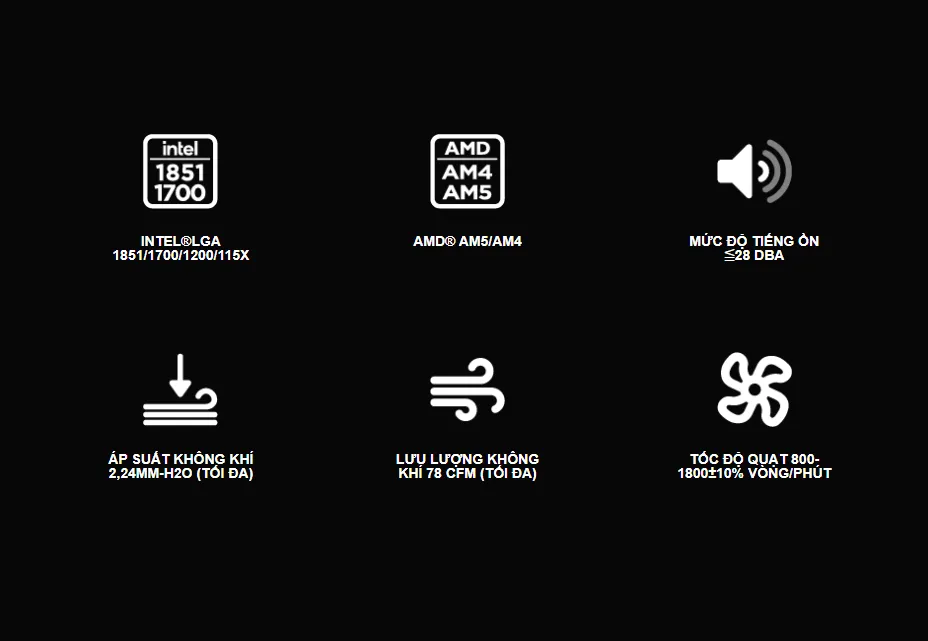 - Quạt 120mm PWM điều tốc tự động, tốc độ 800–1800RPM, lưu lượng gió tối đa 78CFM